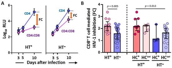 CD8+ T cell-mediated inhibition of the replication of HIV-1-NL4-3-Renilla in CD4/CD8 cocultures was significantly higher in HT+ (N = 13) compared with HT− (N = 20) individuals (p = 0.005) (Figure 1). Moreover, the inhibition was higher in the HT+HC+ group (N = 8) compared with the HT−HCsvr group (N = 17) (p = 0.013).