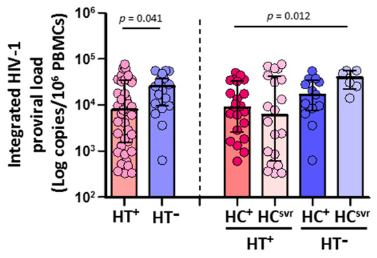 Integrated HIV-1 proviral load in HIV-1-infected individuals with the following coinfections: HT+, HTLV-2 positive; HT−, HTLV-2 negative; HC+, HCV positive; and HCsvr, treated for HCV with sustained virological response. Mann–Whitney U test. Only statistically significant values are shown. Significant when p < 0.05.