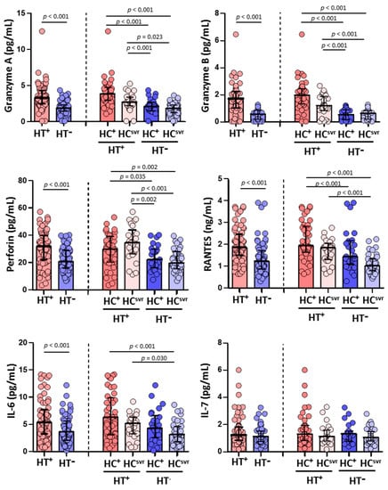 Higher levels of granzyme A, granzyme B, and perforin were found in HT+ individuals (p < 0.001, p < 0.001, and p < 0.001, respectively) compared with HT− individuals. Higher levels were also found in accordance with the HCV infection status (Figure 3). The levels of RANTES and IL-6 were also higher in HT+ individuals (p < 0.001 and p < 0.001, respectively) compared with HT− individuals. Again, the levels were higher in HT+ regardless of HCV infection status (Figure 3). Nevertheless, the level of IL-7 was similar comparing HT+ and HT− individuals regardless of the HCV infection status.