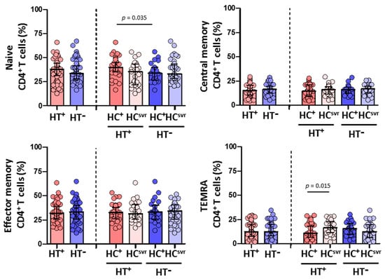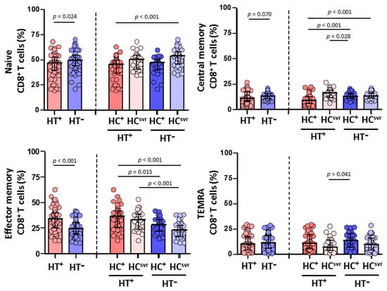 We then evaluated CD4+ and CD8+ T cell subsets in all individuals (Figure 4 and Figure 5, respectively). While no differences were found in the CD4+ T cell subsets between HT+ and HT− individuals (Figure 4), a statistically significant higher level of effector memory CD8+ T cells was found in HT+ compared with HT− individuals (p < 0.001) (Figure 5). These higher levels were balanced with a reduction in the levels of naïve (p = 0.024) and central memory (p = 0.070) CD8+ T cell subsets. Instead, the level of TEMRA (transitory) CD8+ T cell subset was similar between HT+ and HT− individuals. These higher levels of effector memory CD8+ T cells were also found regardless of the HCV infection status. The presence of HCV infection did not alter the level of this cell subset in either HT+ or HT− individuals. Moreover, HCV infection did not alter the level of either naïve or central memory CD8+ T cells.