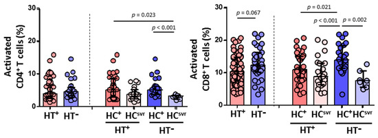 On the other hand, while a similar CD4+ T cell activation was found between HT+ and HT− individuals, HCV infection lead to higher levels of activation in both HT+ and HT− individuals compared with HCsvr individuals (p = 0.023 and p = 0.001, respectively) (Figure 6). However, HTLV-2 associated with lower CD8+ T cell activation was found in HT+ individuals, although not significant (p = 0.067). The presence of HCV infection increased the level of activation compared with HCsvr individuals.