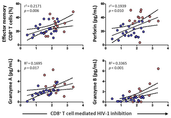Association of CD8+ T cell-mediated HIV-1 inhibition with effector memory CD8+ T cell percentage, and the levels of perforin and granzymes in HIV-1-infected individuals with HTLV-2 infection (red dots) and without HTLV-2 infection (blue dots). Spearman correlation. Significant when p < 0.05.