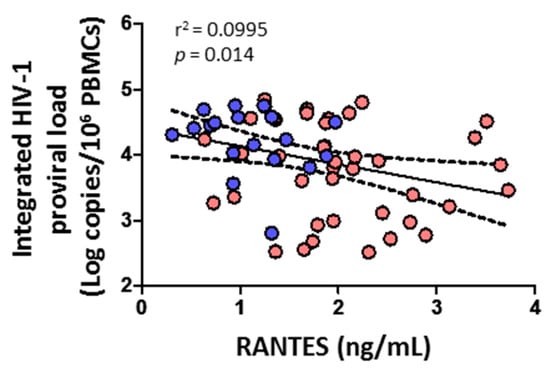 Association of integrated HIV-1 proviral load with soluble chemokine RANTES in HIV-1-infected individuals with HTLV-2 infection (red dots) and without HTLV-2 infection (blue dots). Spearman correlation. Significant when p < 0.05.