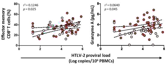 HTLV-2 proviral load positively correlated with the effector memory CD8+ T cell subset (p = 0.025) and the level of granzyme A (p = 0.045) (Figure 9). No correlation was found, however, with cytolytic enzymes, perforin, IL-6, IL-7, HIV-1 viral load, or any CD4+/CD8+ T cell subsets (data not shown).