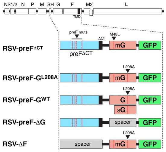 The antibody (Ab) response to RSV infection is primarily directed against two viral surface glycoproteins: the fusion protein (F) and the attachment protein (G). The RSV F protein is essential, as it mediates fusion between the virion and host cell membrane during viral entry. The membrane fusion process requires a conformational change in F from a highly unstable pre-fusion form (preF) to a stable post-fusion form (postF) [3]. This conformational change to the postF form may happen prematurely upon protein or virus manipulation or purification. The latter affects antigenic potential, as it has been shown that the majority of RSV-neutralizing Abs are directed against the preF conformation [3,4]. The RSV G protein is a highly glycosylated mucin-like protein. G is not essential for the infection of immortalized cell lines [5], but is required for the efficient infection in vivo, and the infection of primary well-differentiated human airway epithelial (HAE) cells [6,7,8,9,10]. When grown in Vero cells (one of several FDA-approved cell lines for vaccine production), the G protein was shown to be cleaved by cathepsin L (CatL), presumably due to recycling from the cell surface [11,12]. This resulted in reduced virion infectivity, suggesting that CatL cleavage compromises the attachment function of G [8]. A point mutation (L208A) that blocked CatL cleavage in Vero cells was identified, and this resulted in increased virion infectivity in HAE cells cultures [11]. In addition to a membrane-anchored virion-associated form (mG), a secreted form (sG) is produced by translation initiation at a second methionine codon (M48). sG is a known virulence factor as it acts as an antigen decoy, interferes with RSV clearance, and modulates immune cell functions [13,14,15]. For vaccine purposes, the role of sG is not clear as both detrimental [16] and protective effects [17] have been reported.