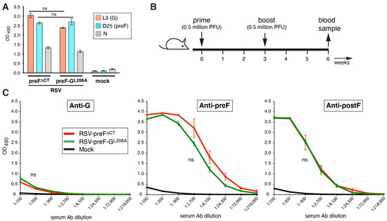We next compared the G and F Ab levels induced by RSV-preF∆CT and RSV-preF-GL208A in mice to examine whether the L208A mutation increased the Ab levels after vaccination. Eight-week-old mice were prime-boost vaccinated intranasally using 0.5 million PFU per dose, as shown in Figure 2B and as previously described [18]. A mock-vaccinated group was included in which the mock vaccine was prepared identically from uninfected Vbac cells. Three weeks after the boost, blood samples were taken, and the Ab levels were determined by ELISA (Figure 2C). In addition to anti-G Abs, we also measured the anti-F Ab levels to ensure that any changes made in G would not negatively impact the anti-F Ab levels. This was conducted using purified his-tagged G, preF, and postF antigens as previously described and validated [18]. The absence of non-specific binding by mouse sera was confirmed in Figure S1. The ELISA results show equal levels of anti-G, -preF, -postF Abs between the two viruses (Figure 2C). Thus, premature CatL cleavage was not a main cause of low anti-G Ab levels induced by virus RSV-preF∆CT.