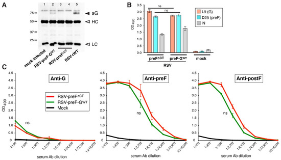 Impact of restoring sG expression on the ability of RSV-preF∆CT to induce anti-G Abs. (A) sG expression by RSV-preF-GWT. HEp-2 cells were infected with the viruses indicated. RSV-rWT, a previously reported surrogate wt virus [36], was included as a positive control for sG expression. Supernatants at 26 hpi were centrifugated at high g-force to remove virus particles and immunoprecipitated using Ab L9 as described in Materials and Methods. A Western blot was generated in which G was detected using Ab L9. Open arrows indicate L9 heavy chain (HC) and light chain (LC) recognized by the goat-anti-mouse HRP secondary. (B) F and G protein expression on the surface of virus-infected cells by cell ELISA, as described in the Figure 2 legend. (C) Serum levels of G-, preF-, and postF-specific IgG Abs induced in mice, vaccinated, as described in Figure 2. Three-fold dilutions of pooled boost sera from mice from two independent experiments (total n = 8/group) were examined by ELISA, as described in Figure 2. Error bars represent the standard deviation of the mean of triplicate samples from pooled sera. In (C), only statistical differences between RSV-preFΔCT and RSV-preF-GWT were determined (ns, non-significant).