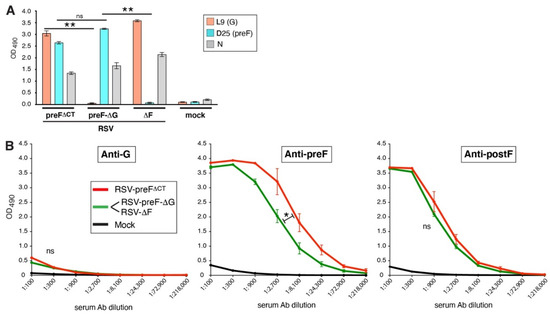 To coat antigens to the plate, nickel-coated plates were incubated with his-tagged purified preF, postF, or G proteins. Purified preF and postF proteins were kindly provided by Jason McLellan (University of Texas at Austin, Austin, TX, USA). Baculovirus produced purified G protein (residues 67 to 298; roughly corresponding to the ectodomain) was commercially acquired (MyBioSource 1059692). Coated plates were washed, blocked with 5% milk powder (Bio-Rad, Hercules, CA, USA), and incubated with mouse sera (pooled from a total of 8–10 mice/group from two independent experiments) diluted in OPTIMEM in three-fold steps with a starting concentration of 1:100. Primary Abs were incubated for two hours at room temperature, followed by wash steps and incubation with HRP-conjugated secondary Ab. Plates were washed three times, and developed using OPD substrate as above. The error bars indicate standard deviation from the mean of triplicate samples from the pooled sera. Each experiment was carried twice independently. Statistical differences between the curves were determined as follows: OD values of selected dilutions were directly compared by unpaired two-tailed Student’s t-tests with Welch’s correction. The differences were determined only when dilutions fell within the linear range of the curves. Statistical significances indicated in the graphs mean that at least two dilutions (from the linear part of the curve) that were tested, were significantly different. In most cases, only statistical differences between the parent vaccine (RSV-preF∆CT) and modified vaccines were determined.
