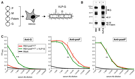 The impact of exogenous G on the ability of RSV-preF∆CT to induce anti-G Abs. (A) Schematic of VLP-G production. Plasmids expressing P, M, Fstem, and G were co-transfected in HEK293 cells as described in Materials and Methods, and VLPs were semi-purified. (B) Protein content of VLP-G. VLP-G made in HEK293 cells were harvested and semi-purified as described in Materials and Methods, pelleted, and examined by Western blot. A plasmid expressing Fstem protein (Fs), which lacks the F ectodomain (residues 36–495) and was included to enhance VLP production, was described previously [37]. The equivalent of 9 µg VLP-G was loaded in one lane. As a comparison, lysate of wt RSV infected cells was included (~7500 cells/lane) as a positive control for G. Primary Abs used for detection were as follows: L9 (G); anti-M peptide serum [35] (M); anti-flag Ab (N and P have flag tags); anti-myc Ab (Fs has a myc tag). Note: the dotted line shows where several lanes were deleted, and the images re-joined; image intensity or appearance was not altered. (C) Serum levels of G-, preF-, and postF-specific IgG Abs induced in mice vaccinated, as described in Figure 2. Three-fold dilutions of pooled boost sera from mice from two independent experiments (total n = 5/group) were examined by ELISA as described in Figure 2. Error bars represent the standard deviation of the mean of triplicate samples. In (C), only statistical differences between RSV-preFΔCT and RSV-preFΔCT + VLP-G were determined (** p < 0.01; ns, non-significant).