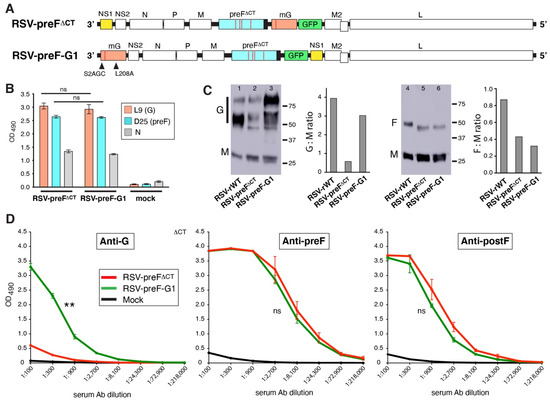 In Figure 6, we found that RSV-preF-G1 did not express higher steady-state levels of G protein in vitro than RSV-preF∆CT. RSV-preF-G1 did, however, have higher G levels in the virion, which may have contributed to the improved mouse serum anti-G Ab levels. Other potentially contributing parameters were mutations in G (L208A and the change of ser2 to AGC) and the altered position of NS1. The latter we cannot directly address, because a control virus would have to have both NS1 and G at first position. We did, however, examine the impact of the G mutations. To do so, RSV-preF-G1 was modified to revert the codon for ser2 to the original TCC or to revert residue 208 to leucine (Figure 7A). The resulting viruses, RSV-preF-G1L208A and RSV-preF-G1S2AGC, respectively, were then subjected to the same cell ELISA and in vivo Ab analyses (Figure 7B,C). In short, viruses RSV-preF-G1S2TCC and RSV-preF-G1L208 expressed very similar levels of G and preF protein in vitro (Figure 7B), and did not change the level of anti-G Ab induction in mice, relative to RSV-preF-G1 (Figure 7C). RSV-preF-G1S2TCC and RSV-preF-G1L208 did each induce a minor but significant increase in anti-postF Abs (p < 0.05) for reasons not understood.