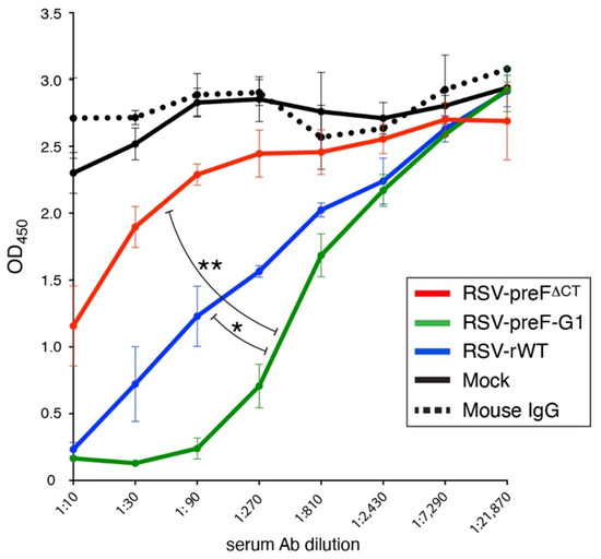 Neutralization of wt RSV in vitro. Neutralization capacity of heat-inactivated mouse sera was determined using wt RSV engineered to express horse-radish peroxidase (RSV-HRP), as described previously [18]. Random mouse IgG and sera from mock-vaccinated mice were included as negative controls. The data points represent the mean of triplicate samples of pooled sera from five mice/group. Error bars represent the standard deviation of the mean. The experiment was performed twice from two independent mouse studies with n = 5 each, with similar results. Statistical, differences were determined between RSV-preF-G1 and RSV-rWT, and between RSV-preF-G1 and RSV-preFΔCT (* p < 0.05; ** p < 0.01). Curve-fit analyses were performed using Prism9, and reciprocal titers that achieved 50% neutralization of RSV-HRP were calculated (see text). Note that a curve fit for RSV-preF∆CT could not be performed due to incomplete neutralization.