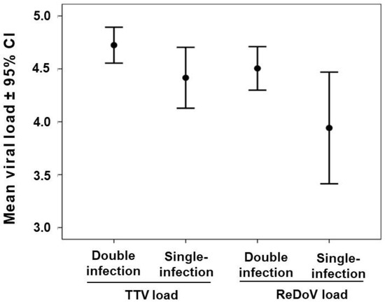 Of these 377 samples, 50% (189/377) reacted positively to both TTV and ReDoV PCRs, and 33% (124/377) were positive to only one PCR. Of these latter samples, 67% (83/124) were TTV positive and ReDoV negative, and 33% (41/124) were TTV negative and ReDoV positive. Sixty-four of 377 (17%) samples were negative for both TTV and ReDoV. Then, we stratified the viral loads of the 313 samples according to the number of viruses they harbored, and the Kruskal–Wallis analysis of variance was used. As in Figure 1, comparing the mean viral loads of single- and dual-virus infections yielded a significant heterogeneity (p < 0.016; Kruskal–Wallis test). The mean viral loads of the single infected samples, namely those infected with TTV or ReDoV alone, showed a lower value when compared to dually infected samples, and Tukey’s multiple-comparison test showed that ReDoV single-infected samples resulted in the only true outlier (p = 0.004).