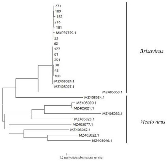 Sequencing was limited to 13 amplicons obtained from independent PCRs. Phylogenetic analysis showed that our isolates were related to the previously published strains and they were all classified within the Brisavirus genus (Figure 2).
