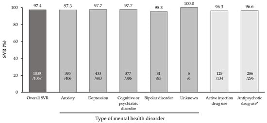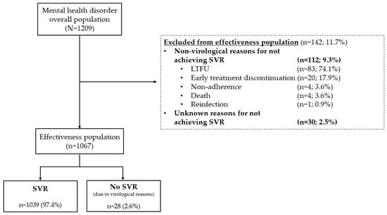 The primary outcome was SVR in the EP overall, and stratified by mental health history, antipsychotic drug use, and injection drug use (IDU). Secondary outcomes were reasons for not achieving SVR, characteristics of patients with non-virological failures, adherence, and time from HCV RNA diagnosis to SOF/VEL treatment initiation.
