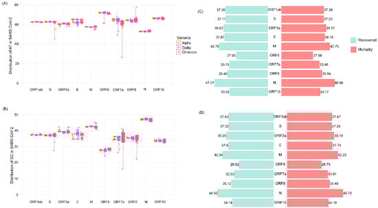 Furthermore, delineating from the whole genome level to different sub-genomic regions of SARS-CoV-2, the analysis highlighted a distinct composition of AT/GC across the genomic regions in the respective groups (Supplementary File S2: Table S2). Intriguingly, we found the structural gene, N, to have the highest GC content across the lineage-based groups, followed by the M and ORF3a genes. On the other hand, ORF6 had the lowest GC percentage in Alpha and Delta, whereas ORF7b was the lowest in Omicron, followed by ORF10 across all the VOCs (Figure 2A,B). The same characteristics were reflected in the recovered and mortality patients of Delta and Omicron (Figure 2C). This possibly highlights the significance of other structural genes during viral evolution in addition to the widely studied genes, ORF1ab and spike.