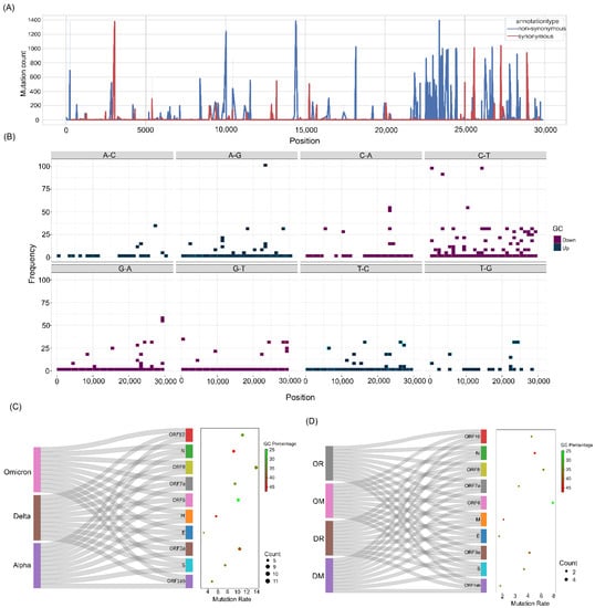 Mutation spectra of the samples and their correlation with GC percentage. (A) Synonymous and nonsynonymous mutation distribution across all the samples. (B) GC-up and GC-down mutations in the SARS-CoV-2 genomes. (C) Correlation of GC percentage and the mutation rate at the lineage level—Alpha, Delta, and Omicron. (D) Correlation of GC percentage and mutation rate in the clinical outcome groups—DR, DM, OR, and OM.