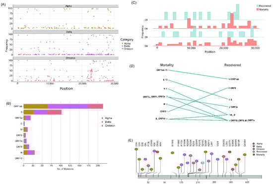 To obtain the mutation spectra of our cohort, the VCFs of Alpha, Delta, and Omicron as well as DR, DM, OR, and OM subgroups were merged separately using bcftools [23]. Subsequently, the relative frequency of each mutation was calculated (Supplementary File S3: Table S3). To highlight the statistically significant mutations, Fisher’s exact test was performed for lineage-based and clinical-outcome-based groups separately using python programming. Furthermore, the Phi correlation coefficient test using R programming was carried out to examine the associations of the significant mutations with the clinical outcomes—recovered and mortality (Supplementary File S4: Table S4).