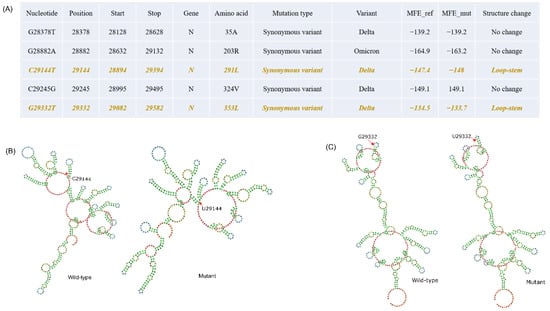 To elucidate the impact of mutations on the RNA secondary structure, we selected five synonymous mutations from the N gene (Figure 5A). While the mutation G28882A was significantly associated with Omicron, the rest of the four mutations were significantly associated with Delta (Figure 5A). From the analysis, we found that the RNA secondary structure is changed when C to U and G to U occur at positions 29144 and 29332, respectively. Subsequently, we observed that both G29332U mutations formed a stem instead of hairpin loop in the mutant with distinct minimum free energy (MFE) (Figure 5). Intriguingly, the mutation C29144U resulted in more negative MFE, which enhanced the RNA thermodynamic stability, while the mutation G29332U gave rise to less negative MFE, which showed a destabilizing effect on the RNA (Figure 5A). Additionally, secondary structure prediction for all the N gene synonymous mutations was performed, and MFEs were observed in the RNA secondary structures (Supplementary File S5: Table S5).