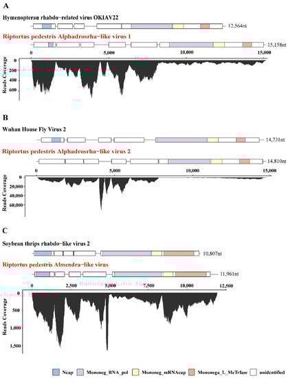 A total of 1,268,096 contigs were generated from the de novo assembly of the clean RNA-seq reads (405,583,244), and details of the assembly can be found in Table S2. The assembled sequences were later blast against the NCBI viral Ref-seq database to identify the potential viruses. As a result, 966 contigs showed high similarities to viral proteins (E-value ≤ 1 × 10 − 20). These contigs (length ≥ 2000 bp) were further searched against the NCBI NT and NR databases to confirm the viral-like sequences. It was observed from Table 1 that 13 viral contigs were identified in R. pedestris, representing 10 potential RNA viruses related to an order: Picornavirales and the following families: Iflaviridae, Rhabdoviridae, Permutotetraviridae and Flaviviridae (Table 1). Among them, 4 ISVs in R. pedestris collected from Anhui and Shandong provinces shared extremely high similarities to Riptortus pedestris virus-1 (RiPV-1) (≥99.0% aa identity, N = 3) and Riptortus pedestris virus-2 (RiPV-2) (≥98.9% aa identity, N = 1), annotated as unassigned insect RNA viruses found from bean bugs [25,26]. Another two ISVs in R. pedestris collected from Shandong Province had 94.64% and 94.75% identities with Guiyang srgiope bruennichi iflavirus 1, which belongs to the genus Iflavirus in the family Iflaviridae (Table 1). In addition to the known ISVs described above, seven novel viral-like contigs were also identified that exhibited low homology (≤45%) with known viruses (Table 1). The novel viruses identified in this study were named according to the isolated host and related family or genus, followed by a number, e.g., Riptortus pedestris Alphadrosrha-like virus 1. To further confirm the presence of these viruses in R. pedestris, the coverages of the 13 viral contigs were estimated by mapping clean-read sequences to the corresponding genome sequence. These transcripts were distributed throughout the entire viral sequence with high abundance at some loci, which might be the translation hotspots of the viruses (Figure 1 and Figure S1). The presence of ISVs was then verified with RT-PCR (Figure S2).