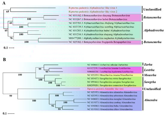 To determine the taxonomic status of the three novel viruses, phylogenetic analysis was performed based on the aa sequence of RdRp using ML methods. The two novel viruses RpALv1 and RpALv2 were clustered together in a distinct clade and were separated from those viruses in the genera Alphadrosrha and Betanemeha, which were supported by high bootstrap values (Figure 2A). Based on the new genus demarcation criteria of Rhabdoviridae by ICTV [38], it is speculated that RpALv1 and RpALv2 may belong to a new genus in this family. Similarly, ML tree suggested that RiALv is also separated from those viruses in known genera, as supported by a relatively high bootstrap value (Figure 2B). Thus, phylogenetic analysis clearly showed that the three newly identified viruses (RpALv1, RpALv2 and RiALv), possibly belonging to new genera, are the new members in the family Rhabdoviridae.