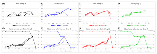 The disease dynamics of groups 2, 3, and 4 were similar to those of group 1. In the three groups, the rectal temperature increased to above 40 °C at 3–6 DPI (