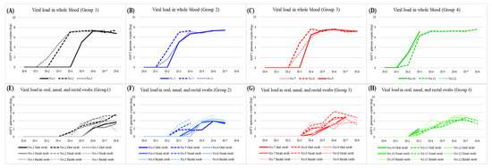 Groups 2, 3, and 4 also showed similar patterns of viremia and viral shedding via oral, nasal, and rectal routes. Viral loads in the blood were detected at 2–5 DPI in these groups. The viral titers increased to more than 10