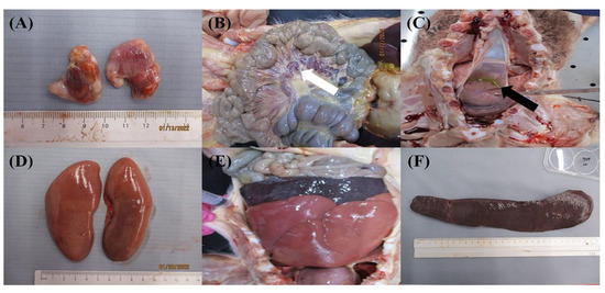 Samples, including whole blood with EDTA, serum, and swabs from the oral and nasal cavity and rectum, were collected from the day of inoculation to the day before death. Pigs were manually restrained for sample collection. Whole blood and serum samples were collected from the jugular vein. Swab specimens were collected using sterile cotton swabs in a transport medium (Noble Biosciences, Hwaseong, South Korea). All pigs were subjected to necropsy soon after euthanasia or death. Tissue collected during necropsy included spleen, liver, kidney, heart, forelimb muscle, and the submaxillary, inguinal, mesenteric, hilar, and gastrohepatic lymph nodes.