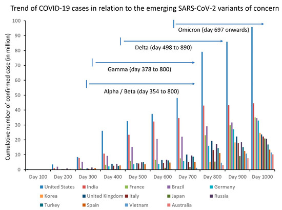 Soon after the first reported case of COVID-19, the WHO was monitoring the global epidemiology of COVID-19 by regularly updating the situation report since 21 January 2020 [36]. In addition, data on the number of COVID-19 cases and deaths was also available in the public domains of the European Centre for Disease Prevention and Control [37], academic institutions [38], and public media [39,40,41,42]. On 11 March 2022 (two years after the start of the COVID-19 pandemic), there were 447 million confirmed cases, constituting 6% of the global population, about the combined population size of the 27 countries making up the European Union, with 6 million (0.075% of the world population) deaths [43]. As of 25 September 2022 (day 1000), 14 (6.3%) of 222 countries or areas had recorded over 10 million cumulative confirmed cases (Table 1). These 14 countries accounted for 407 million cases, which constituted 67% of the COVID-19 infections in the world.