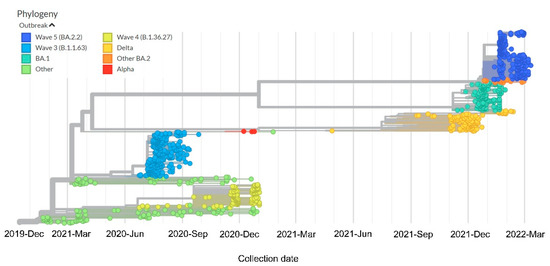 Time-resolved phylogenetic tree of 1168 viral genomes from January 2020 to March 2022 in Hong Kong. The tree was constructed using the Nextstrain command-line interface. The color of the dots represents the outbreak wave of a particular strain. The branch length was determined by the collection date of a sample. Wuhan-Hu-1 was used as the reference sequence during the tree construction.
