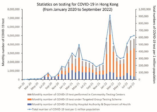 In addition to the progressive enhancement of COVID-19 testing in the hospitals from a risk-based approach to universal admission screening, widespread utilization of the RT-PCR test for SARS-CoV-2 was implemented in stages at the airport for inbound travelers, in government outpatient clinics for symptomatic cases, and in community testing centers for the general population with risk of exposure to COVID-19 [134]. Early recognition of asymptomatic or mildly symptomatic patients for isolation might have reduced the risk of community transmission. Compulsory testing for COVID-19 in the community was enacted by law, The Prevention and Control of Disease (Compulsory Testing for Certain Persons) Regulation, Cap. 599J, in Hong Kong [135]. Any persons who had visited public or private premises and resided in buildings where there was outbreak or transmission of COVID-19 as evidenced by epidemiological investigations or sewage surveillance were informed of the need to undergo COVID-19 testing by a compulsory testing notice. Compulsory testing operations in specified restricted geographic areas were also implemented for the control of COVID-19, as provided by restriction-testing declaration under Hong Kong legislation [136]. With the implementation of compulsory testing notices and restriction-testing declarations, mass testing of 0.81 million members of the population, along with phylogeographic analysis of positive cases, successfully controlled the community outbreak of the Beta variant in Hong Kong [134]. The number of COVID-19 tests performed in different categories during the COVID-19 pandemic is illustrated in Figure 7.