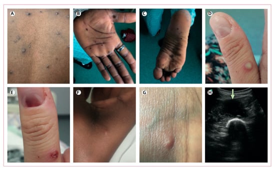 Skin and soft tissue manifestations of monkeypox. Skin and soft tissue features included: (A,D) vesicular or pustular lesions; (B,C) macular lesions involving the palms and soles; (D,E) a sub-ungual lesion; (F,G) more subtle papules and smaller vesicles; (H) and a deep abscess (arrow, image obtained during ultrasound-guided drainage). From: Adler H, Wingfield T, Price NM: Clinical Features and Management of Human Monkeypox: A Retrospective Observational Study, in the UK Lancet Infect Dis 2022; 22: 1153-62. Copyright 2022 by Elsevier. License number for the reuse of this figure: 5414980739216.