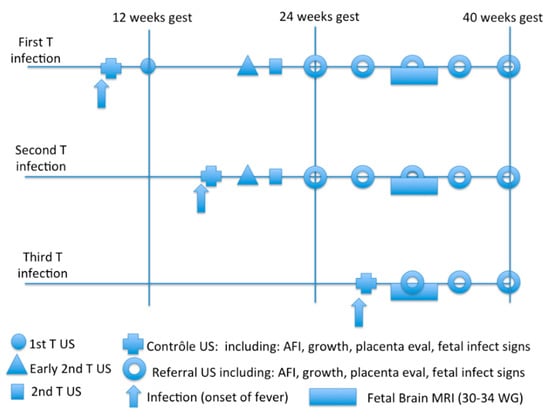 For second- and third-trimester infections, the follow-up should be the same as that of the first-trimester infection, with a referral ultrasound performed monthly. According to the study by Mbala et al., a close follow-up (on a weekly basis) could be added after the acute phase of the maternal infection, with vitality, Doppler and amniotic fluid assessments, due to the risk of intra-uterine fetal demise [57].