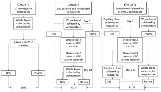 Group 3: Blood samples were drawn from 50 healthy women aged 16 to 39 randomly selected from a group of 19,640 women from 67 villages in Matlab, Bangladesh, participating in the main HEV 239 vaccine trial [11]. The women received either HEV 239 or a control vaccine (HBV) at day 0, 30 and 180. Paired venous and capillary blood were collected from each participant before vaccination and 30 days after the third vaccine dose. Venous blood was drawn by venipuncture into EDTA-coated tubes. Capillary blood was collected by finger prick onto a Whatman 903 filter paper card (Sigma-Aldrich, St. Louis, MO, USA).