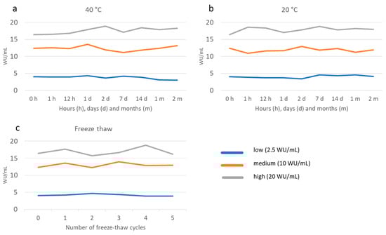 Stability of DBS stored at 40 °C (a) and 20 °C (b) for up to 60 days and a various number of freeze-thaw cycles (c) as measured by HEV IgG in international units (WU/mL) at various time points.