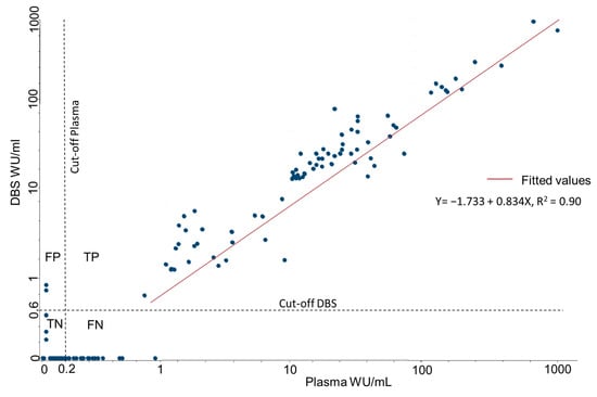 Correlation between IgG concentrations obtained from plasma and DBS, standardized to WU/mL, based on the results from 300 paired DBS and plasma samples. FP = False positive, TP = True positive, TN = True negative, FN = False.