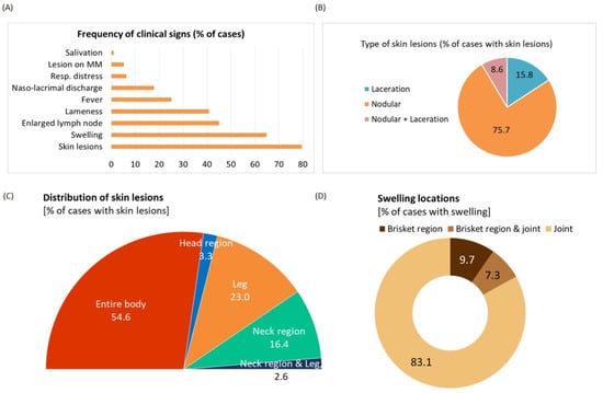 Clinical observations and distribution of lesions of the affected cattle population. (A) Frequency of clinical signs shown by the affected cattle. (B) Pie chart showing the type of skin lesions that were classified as nodular, laceration, and both. (C) Half pie chart showing the distribution of skin lesions in different parts of the body. (D) Pie chart revealing the occurrence of swelling in different body parts.
