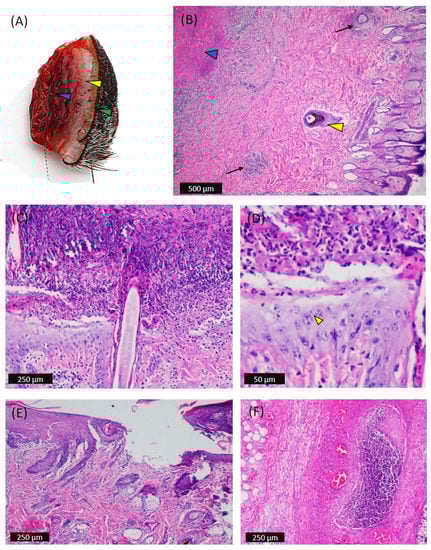 Gross and microscopic pathology of the skin nodules in affected cattle. (A) Biopsy of a skin nodule that was 2 cm in diameter that provided gritty sound when cut and showed hemorrhagic subcutis (blue arrowhead), pale dermis (yellow arrowhead), and haired epidermis (green arrowhead). (B) Epidermis: epidermal cytoplasmic swelling and mononuclear infiltrate. Dermis: diffuse proliferation of mononuclear cells between the dense irregular connective tissue and reticular layers and in the perivascular space (black arrow). Sweat and sebaceous glands were found dilated, and there was intracellular edema of sebaceous gland cells. The hair follicle matrix epithelia were found to be highly hyperplastic (yellow arrowhead). Subcutis: presence of an infarct (blue arrowhead). (C) Epidermis and dermis: vacuolation, swelling, and adhesion of scabs with proliferative stratum basale, intraepidermal necrosis, and accumulation of scale crust leaving ulcer underneath; in addition, the dermis was hemorrhagic, edematous, and infiltrated with mononuclear cells. (D) Occasionally, keratinocytes were consistent with intracytoplasmic inclusion bodies (yellow arrowhead). (E) Vacuolation and swelling of keratinocytes, epidermal proliferation of basal cells, infiltration of round histiocytic cells in the reticular layer of skin, swelling, and vacuolation of glandular epithelium and focal ulceration. (F) Subcutis: presence of focal aggression of mononuclear cells, congestion, necrosis, and lysis of subcutaneous fat cells.