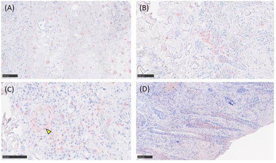 Immunohistochemistry revealed LSDV antigen laden macrophages throughout the subcutis (Figure 5A). The LSDV antigen was detected occasionally in hair follicle epithelial cells, the endothelium and smooth muscle cells of the blood vessels, and histiocytic cells (Figure 5B–D).