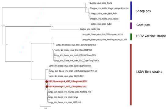 The obtained complete sequences of two isolates (BD-V392.1 and BD-V395.1) along with other representative field and vaccine strains of LSDV, sheeppox virus, and goatpox virus were downloaded from a public domain site (NCBI GenBank). The selected sequences were then subjected to multiple alignment using the MAFFT software’s online version (https://mafft.cbrc.jp/alignment/server; accessed on 13 September 2022). The phylogenetic analysis was performed using the neighbor-joining method and Jukes–Cantor substitution model incorporated in the MAFFT package with the confidence intervals estimated by applying a 1000-sample bootstrap algorithm []. Finally, the phylogenetic trees were annotated and visualized using FigTree v1.4.2 (http://tree.bio.ed.ac.uk/software/figtree; accessed on 14 September 2022) and Inkscape 1.0 (https://inkscape.org; accessed on 14 September 2022).