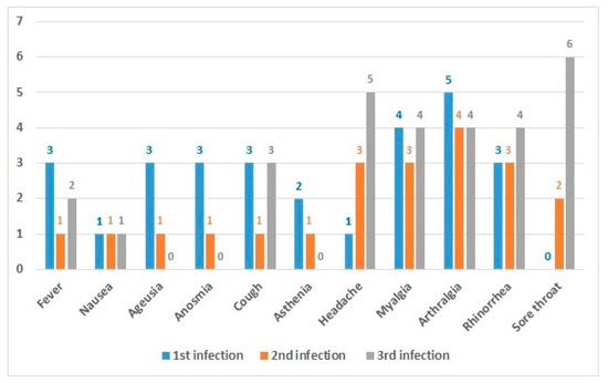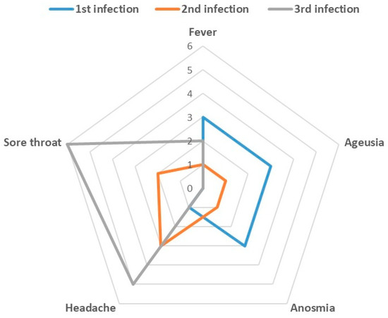 Table 2 displays symptom categories (no symptoms, minor, major, hospitalisation) and vaccination status in first, second, and third infections, while Figure 2 and Figure 3 detail the type of symptoms. The median value (IQ25–75) of symptoms duration among 1st, 2nd, and 3rd infections was 4 days (0-6), 0 (0-4) and 3 (1, 5-3,5), respectively.
