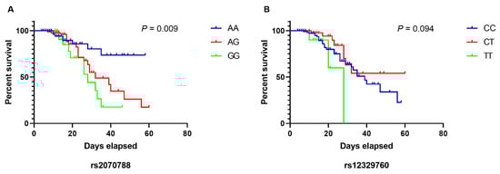 Influence of the transmembrane serine protease type 2 (TMPRSS2) polymorphisms on the risk of death in older individuals hospitalized with COVID-19 according to Kaplan–Meier method. (A) rs2070788, mean time (days) GG: 28.7, AG: 36.9, AA: 48.6, log-rank = 0.009. (B) rs12329760, mean time (days) TT: 23.8, CT: 44.4, TT: 38.3, log-rank = 0.094.