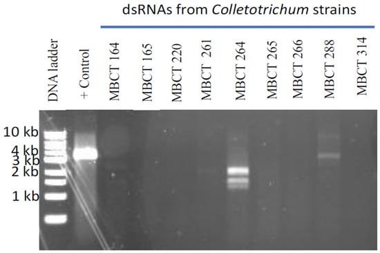 The mycelial blocks of Colletotrichum strains were transferred from PDA plates to potato sucrose broth and cultured for seven days at 27 °C with an orbital shaker at 120 rpm. Collected mycelia were dried and kept at −30 °C before use. Total nucleic acids were isolated and dsRNAs were purified using Cellulose D (Advantec Toyo Roshi Kaisha, Ltd., Tokyo, Japan) as described by Okada et al. []. Total nucleic acids were extracted with equal volumes of phenol-chloroform-isoamyl alcohol (PCI; 25:24:1) after crushing 0.1 g (dry weight) of fungal mycelium in 0.5 mL of extraction buffer (100 mM NaCl, 10 mM Tris-HCl pH 8.0, 1 mM EDTA, 1% SDS and 0.1% (v/v) mercapto-ethanol). After centrifugation, the supernatant was combined with ethanol (final 16%) and dsRNA was purified by employing a spin column. Finally, the dsRNAs were precipitated with ethanol and preserved at −80 °C. The isolated dsRNAs were visualized using electrophoresis in 0.8% (w/v) agarose gels stained with ethidium bromide.