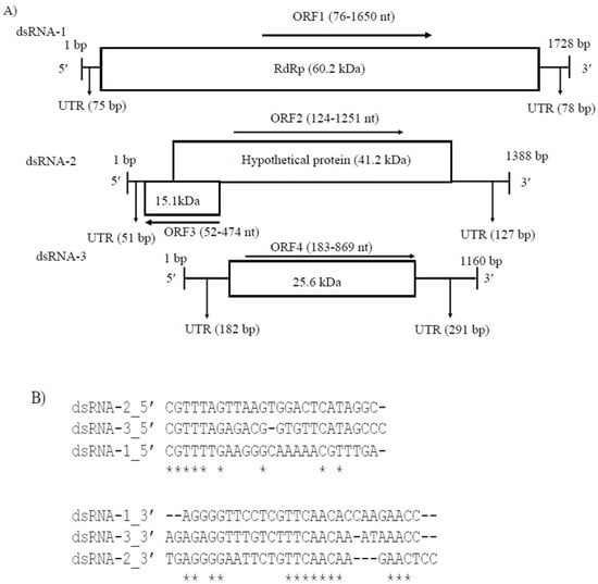 Partiti-viruses typically have two dsRNA segments (1.3 to 2.5 kb in length) with or without the poly (A) tail, one of which encodes RdRp and the other CP [], although the presence of one or more additional dsRNA segments has been documented in several partitiviruses. CaPV1 had three genome segments, lacked the poly(A) tail and the sizes of dsRNA-1 (1728 bp) and dsRNA-2 (1388 bp) were consistent with the typical genome sizes of RdRp- and CP-coding segments of other partitiviruses but not alphapartitiviruses. dsRNA-1 (48.1% G+C content, GenBank accession number OP471414) had one large ORF (ORF1), dsRNA-2 (49.6% G+C content, GenBank accession number OP471413) had two ORFs (ORF2 and ORF3) and dsRNA-3 (49.6% G+C content, GenBank accession number OP471412) had one ORF (ORF4) (Figure 2A). The UTR sequences at the 5′ and 3′ ends of dsRNA-1, -2 and -3 had considerable pairwise similarity between three segments (Figure 2B). The sequence motif 5′-CGTTTT/A-3′ was identified in the 5′-UTR of all three dsRNA segments, indicating a common viral origin for these segments. CaPV1 ORF1 encoded a 524-aa protein with a calculated molecular mass of 60.3 kDa (Figure 2A), which contained the RdRp conserved domain (pfam00680, Interval: 40–474, E-value: 2.10 × 10−34) (Figure 2A). A BLASTp search indicated that it had the highest aa identity to RdRp of CgPV1 (GenBank accession number QED88095; E value = 0.0 and 88.95% identity) and PvLaPV4 (GenBank accession number QHD64807.1; E value = 0.0 and 72.78% identity), which are members of the family Partitiviridae (Table S4). Multiple alignments of RdRp amino acid sequences from CaPV1 and related viruses in the Partitiviridae family revealed conservation of six distinct conserved motifs (III–VIII) of RdRp (Figure 2C) [,,]. CaPV1 ORF2 was anticipated to encode a 375-aa protein with a molecular mass of 41.2 kDa (Figure 2A). A BLASTp search demonstrated that the ORF2 product exhibited a 21.9 to 73.4% similarity to hypothetical proteins or CP encoded by some partitiviruses. Among these, the best identity match (73.4%) was found with the hypothetical protein of CgPV1 with 100% sequence coverage (Table S5). BLASTp hits of CaPV1 ORF2 also included CPs of EnaPV7 (query cover 98.0% and 59.9% identity) and AnPV1 (query cover 97.0% and 27.7% identity), indicating that the ORF2 product of CaPV1 may function as a CP. In addition, a multiple sequence alignment of these putative CPs encoded by CaPV1 and closely related viruses in the family Partitiviridae also showed several conserved regions throughout the whole protein (Figure 2D). CaPV1 ORF3 partly overlapped with ORF2 and was found on the negative strand of the virus (Figure 2A). It encoded a 140-aa protein with an estimated molecular mass of 15.1 kDa (Figure 2A). The conserved domain searches found no conserved domains in CaPV1 ORF3 and BLASTp found no similarity to any of the proteins in the nr database of NCBI. The shortest RNA segment, dsRNA-3, had ORF4, which was made up of 228 aa. A BLASTp search of the dsRNA-3 sequence revealed no significant similarities to any nucleotide sequences in the GenBank database. However, when we aligned this ORF4 product of CaPV1 with the hypothetical proteins encoded by dsRNA-3 of CgPV1 (QED88098) and PvLaPV4 (QHD64811), several conserved regions appeared, where the most notable was the conserved motif “FQPGRFSPVVEIV” at their 5′ ends (Figure 2E).