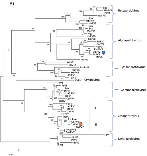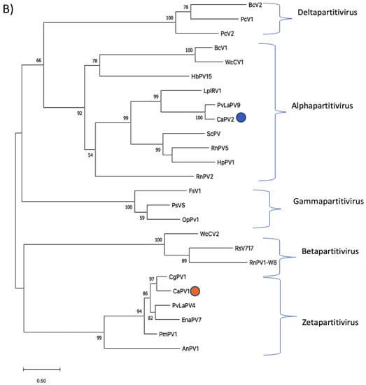 Phylogenetic analyses of RdRps (A) and CPs (B) of CaPV1, CaPV2 and related partiti-viruses using the function “build” of ETE3 3.1.2 [] as implemented on the GenomeNet (https://www.genome.jp/tools/ete/, accessed on 2 September 2022). Alignment was performed with MAFFT v6.861b with the default options []. ML tree was inferred using IQ-TREE 1.5.5 ran with ModelFinder and tree reconstruction []. Best-fit models, according to BIC, were VT+F+R5 and VT+F+I+G4 for RdRp and CP phylogenetic trees, respectively. Tree branches were tested by SH-like aLRT with 1000 replicates. Different members of the partiti-virus genera, including Alpha-, Beta-, Delta-, Gamma- and the proposed Epsilonpartitivirus were included in the analyses. Viruses found in this study were marked with a circle. Bootstrap values are indicated at the branches. The scale bar (lower left) represents the genetic distance of 0.50 for the phylogenetic tree of partitiviral RdRps (A) or CPs (B). Full names and GenBank accession numbers of the viruses listed in Tables S1–S7.
