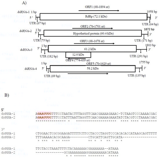 CaPV2 made up of four genomic segments: dsRNA-1 (1958 bp), dsRNA-2 (1872 bp), dsRNA-3 (1803 bp) and dsRNA-4 (1755 bp) (Table S3, Figure 4A). The GC content of dsRNA-1 (GenBank accession number OP471411), dsRNA-2 (GenBank accession number OP471410), dsRNA-3 (GenBank accession number OP471409) and dsRNA-4 (GenBank accession number OP471408) full-length sequences was 44.1, 47.7, 44.9 and 42.2%, respectively. The segment size of dsRNA-1 (1958 bp) of CaPV2, which encoded RdRp, was within the range of RdRp-encoding segments of other alphapartitiviruses (1866–2027 bp), while the genome size of CaPV2 dsRNA-2 that encoded CP (1872 bp) was relatively larger than those of the previously reported CP-encoding segments (1708–1866 bp) of the same genus. The nucleotide sequences at the 5′-termini of dsRNA-1 and dsRNA-2 shared a high sequence identity (86%) and contained a conserved sequence “GAAUUUC/GAATTTC” (Figure 4B), in which the G adjacent the 5′-termini was followed by an A, U(T), or C but not by another G for the succeeding five or six nucleotide positions, which are distinctive features of partitiviruses []. 5′-UTRs of both CaPV2 genome segments also showed a significantly similar secondary structure, which could play a role in segment recognition of the virus (Figure 4C) []. Non-A residues caused interruption in A-rich regions in the 3′-termini of dsRNA-1 and dsRNA-2, which was shown in other alphapartitiviruses (Figure 4B) [].