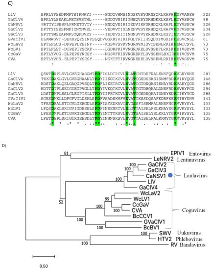 A single genome segment of CaNSRV1 (7233 nt, GenBank accession number OP471407) was found from the Colletotrichum strain MBCT-264, which lacked a poly (A) tail region and had an ORF (ORF1) in its complementary (vc) strand. 5′- and 3′-ends of the CaNSRV1 genome were significantly similar to their respective ends in Grapevine associated cogu-like virus 3 (GaCLV3) or Grapevine laula-virus 3 (GLV3), Grapevine associated cogu-like virus 2 (GaCLV2) or Grapevine laula-virus 2 (GLV2) and Laurel Lake virus (LLV) of the Phenuiviridae family. ORF1 product consisted of 2382 aa with a predicted molecular weight of 274.0 kDa (Figure 5A). The NCBI domain search of the ORF1-encoded protein of CaNSRV1 identified the RdRp conserved domain of members of the order Bunyavirales (pfam04196, Bunya-RdRp; E-value: 2.10 × 10−35; Interval: 727–1387 aa) (Figure 5A). BLASTp analysis revealed that CaNSRV1 RdRp is most similar to the RdRp of GaCLV2 and GaCLV3, with pairwise identities of 69.7%, a value below the threshold of a species demarcation criteria (90%) of most genera in the order Bunyavirales (Table S8). Furthermore, aa alignments of RdRp of CaNSRV1 and related viruses verified the presence of the six conserved motifs of Bunyavirales RdRps, including pre-motif A and motifs A to E. CaNSRV1 possessed the motifs A (DATKWC), B (QGILHYTSS), C (SDD) and D (KS) (Figure 5B). The motif E had tetrapeptide E(F/Y)xS, which was seen in the polymerases of segmented negative-sense RNA viruses [,]. The basic residues K, R and R/K in pre-motif A, as well as a glutamic acid (E) downstream of pre-motif A, were also found to be conserved [,]. The N-terminal region, located upstream of pre-motif A of the RdRp of CaNSRV1, contained the endonuclease conserved motif involved in cap-snatching (H218D228PD245–246ExT257–260K276), a strategy used by many negative-stranded viruses to translate viral proteins by using capped terminal ends from host mRNAs (Figure 5C) []. These findings indicate that ORF1 product of CaNSRV1 represents RdRp of negative-stranded ssRNA viruses, especially bunyaviruses. A phylogenetic tree revealed that the RdRp of CaNSRV1 formed a monophyletic group with those of LLV, GaCLV2, GaCLV3 and GaCLV4, which belong to the genus Laulavirus. Furthermore, the clade containing CaNSRV1 and these laulaviruses was a part of a superclade that also included a cogu-virus clade (Figure 5D), which contained Citrus concave gum-associated virus (CCGaV), citrus virus A (CVA) and watermelon crinkle leaf-associated virus-1 and -2 (WMLaV1 and 2), members of the Coguvirus group that infect plants. Therefore, we conclude that CaNSRV1 is a novel member of the genus Laulavirus in the family Phenuiviridae.