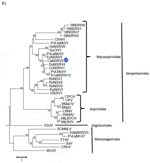 (A) Schematic representation of the CaNSRV2 genome organization. (B) Sequence alignments of the terminal ends of CaNSRV2 RNA-1 and RNA-2. (C) The multiple alignment of the RdRp sequences of CaNSRV2 and the other related viruses, which indicated four conserved motifs: motif A(SLLLDIEGHNQSMQ), motif B (QLGGIEGWLNPLWTL), motif C (YSDD) and motif D (ADGIRADSTLKRL) and pre-motif A (KEREQKYEARLF). (D) Bipartite nuclear localization signals (NLSs) predicted in the RdRp protein of CaNSRV2. (E) Alignment and phylogenetic reconstructions were performed using the function “build” of ETE3 3.1.2 [] as implemented on the GenomeNet (https://www.genome.jp/tools/ete/, accessed on 2 September 2022). Alignment was performed with MAFFT v6.861b with the default options []. ML tree was inferred using IQ-TREE 1.5.5, run with ModelFinder and tree reconstruction []. The best-fit model, according to BIC was LG+F+R5. Tree branches were tested by SH-like aLRT with 1000 replicates. CaNSRV2 was marked with a circle. The scale bar (lower left) represents the genetic distance of 1 for the phylogenetic tree of RdRps.