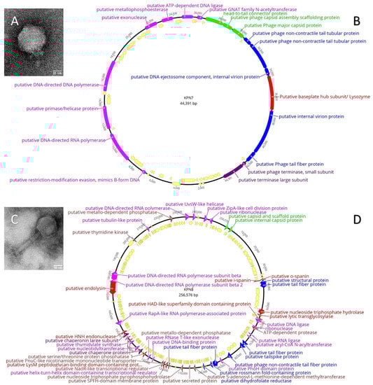 Characterisation of bacteriophages KPN7 and KPN8. (A,C): Electron micrographs of bacteriophage KPN7 (A) (Capsid dimensions: diameter = 62.3 ± 1 nm, Tail length = 15.3 ± 3 nm, Tail width = 15.6 ± 1 nm) showing a typical Podovirus morphology and bacteriophage KPN8 (C) (Capsid dimensions: diameter = 130.2 ± 3 nm, Tail length = 196.1 ± 4 nm, Tail width = 53.7 ± 11 nm) shown with a typical Myovirus morphology. (B,D): Genomic representation of bacteriophages KPN7 (B) and KPN8 (D), shown in circular form for ease of visualisation. Putative functions of genes are denoted by purple (putative packaging protein), green (putative head or capsid structural protein), blue (putative tail structural genes), red (putative lysin proteins), brown (putative metabolic proteins), and pink (putative DNA manipulation proteins). Hypothetical proteins are shown in yellow.