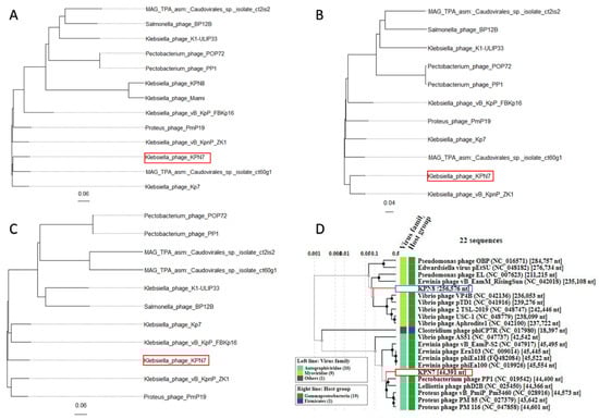 Phylogenetic and proteomic analysis of the bacteriophages KPN7 and KPN8 (highlighted in red and blue rectangles, respectively). Phylogenetic tree construction carried out with 100 bootstraps for putative capsid protein (A) putative terminase protein (B) and putative DNA polymerase proteins (C). To ascertain genomic viral taxa, viral protein analysis was constructed using VIPTree webserver (D).