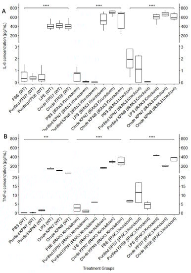 KPN7 and KPN8 were tested for their capacity to stimulate the production of IL-6 and TNF-α in monocyte cell lines, including those with an IRAK3 knockdown (partial expression) and a complete IRAK3 knockout (lacking IRAK3 expression) phenotype. In this analysis, the crude bacteriophage preparations involving only the 0.2 µm filtration process (sufficient to remove whole bacterial cells, but not bacterial cell debris), and the highly purified bacteriophage suspensions (where bacterial cell debris such as endotoxin and LPS is removed, as described in the methods) were assessed. Both KPN7 and KPN8 revealed relatively similar results with the highly purified preparations, showing similar levels of IL-6 stimulation as the PBS control. The crude preparations induced a significantly higher IL-6 level in comparison, in all monocyte cells regardless of the IRAK3 functionality (p < 0.001) (Figure 3A). The IL-6 levels induced by the crudely prepared bacteriophage suspensions was similar to those induced by commercial LPS solution (Figure 3A). This observation was consistent with that seen in the TNF-α induced assays (Figure 3B). Combining the data from all the six samples tested in each of the three phenotypically distinct monocyte cell lines, it was observed that for both IL-6 and TNF-α stimulation the wild type cells showed the lowest inductions followed by the monocytes with IRAK3 knockdown, and highest levels were seen in the IRAK3 knockout THP-1 monocytes (p < 0.001). IL-6 production stimulated by purified KPN7 and KPN8 was lower (less than 2 pg/mL) across all cell lines used. In the wild-type THP-1 monocytes, IL-6 was at a mean (Q1–Q3) of 0.3 (0.2–0.5) pg/mL and 0.2 (0.1–0.7) pg/mL for KPN7 and KPN8, respectively. In the IRAK3 knockdown THP-1 monocytes, the IL-6 mean (Q1–Q3) concentrations for KPN7 and KPN8 were 0.04 (0.007–0.09) pg/mL and 0.01 (0.007–0.03) pg/mL, while in the IRAK3 knockout cells, the mean (Q1–Q3) was 1.1 (0.01–2.2) and 0.05 (0.03–0.08), for KPN7 and KPN8, respectively. Similarly induced TNF-α were also lower. Mean (Q1–Q3) of the TNF-α levels for the purified KPN7 and KPN8 in the wild-type THP-1 monocyte cell lines were 0.02 (0.01–0.06) pg/mL and 1.44 (1.1–1.67) pg/mL, respectively. In the IRAK3 knockdown THP-1 monocytes, the mean (Q1–Q3) TNF-α levels induced by KPN7 were 0.93 (0.26–1.61) pg/mL while those produced by the KPN8 were 5.93 (5.87–5.98) pg/mL. When monocytes had no functional IRAK3, the purified bacteriophages stimulated mean (Q1–Q3) TNF-α levels that were 11.37 (5.8–16.95) pg/mL and 4.56 (2.4–5.78) pg/mL for KPN7 and KPN8, respectively. The data on the mean and quantiles across all cell lines are summarised in supplementary Tables S3 and S4.